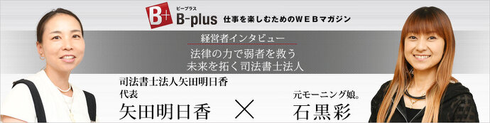『仕事を楽しむためのWEBマガジン - B-plus』誌の「経営者インタービュー」企画にて、当社代表の矢田明日香が元モーニング娘。の石黒彩氏と対談いたしました。
